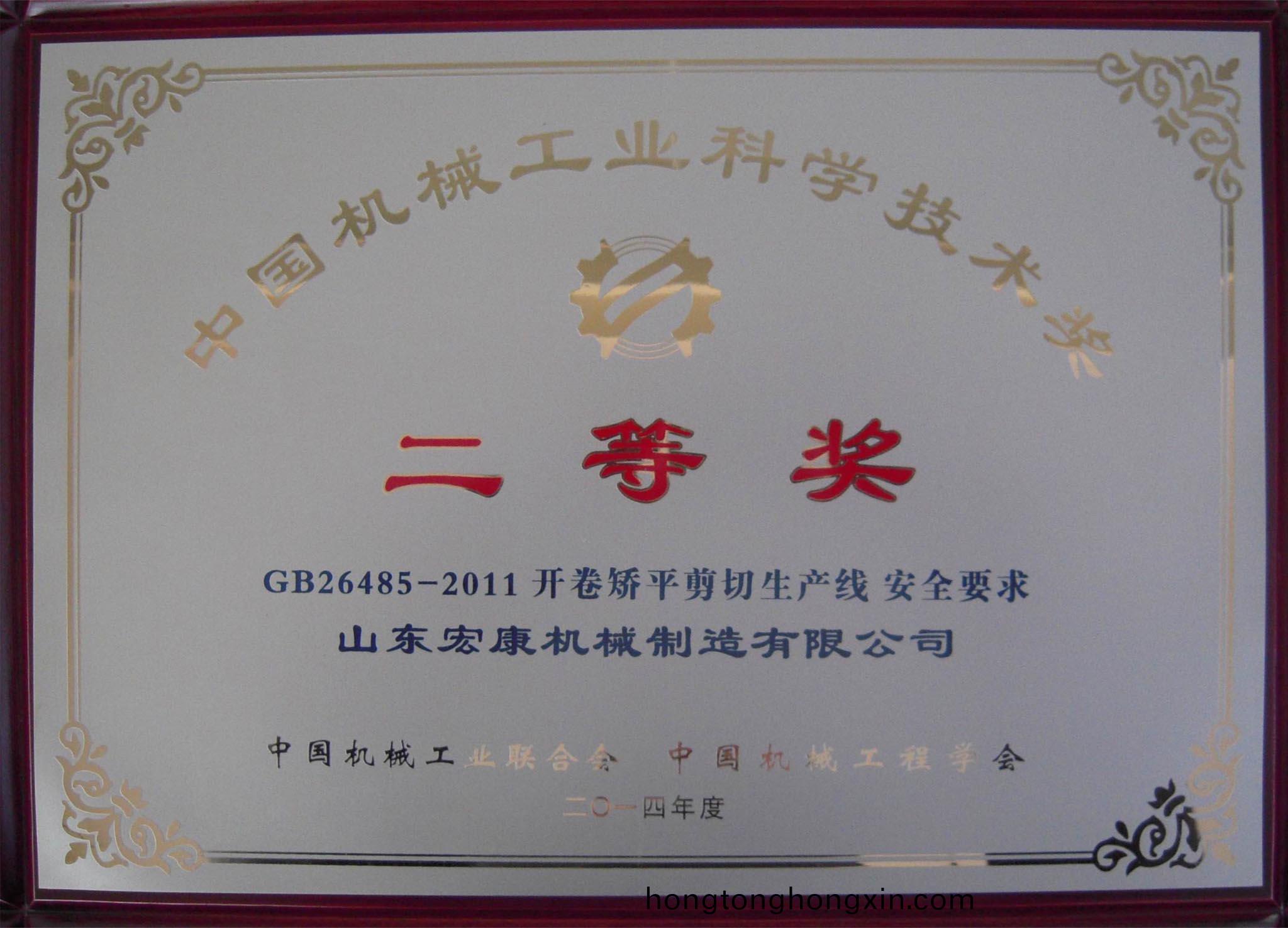 根(gen)據(ju)中國機(ji)械(xie)工(gong)業科學(xue)技術(shu)獎(jiang)勵工作(zuo)辦(ban)公室《關(guan)于(yu)錶(biao)彰2014年度中(zhong)國機械(xie)工(gong)業科學技(ji)術獎獎勵項(xiang)目(mu)的通報》,集(ji)糰公(gong)司主(zhu)持製(zhi)定(ding)的(de)《GB26485-2011 開捲(juan)矯(jiao)平(ping)剪切生(sheng)産線(xian) 安全要(yao)求》國傢(jia)標準穫中(zhong)國(guo)機(ji)械(xie)工(gong)業(ye)科(ke)學技(ji)術(shu)進步(bu)二(er)等(deng)獎。