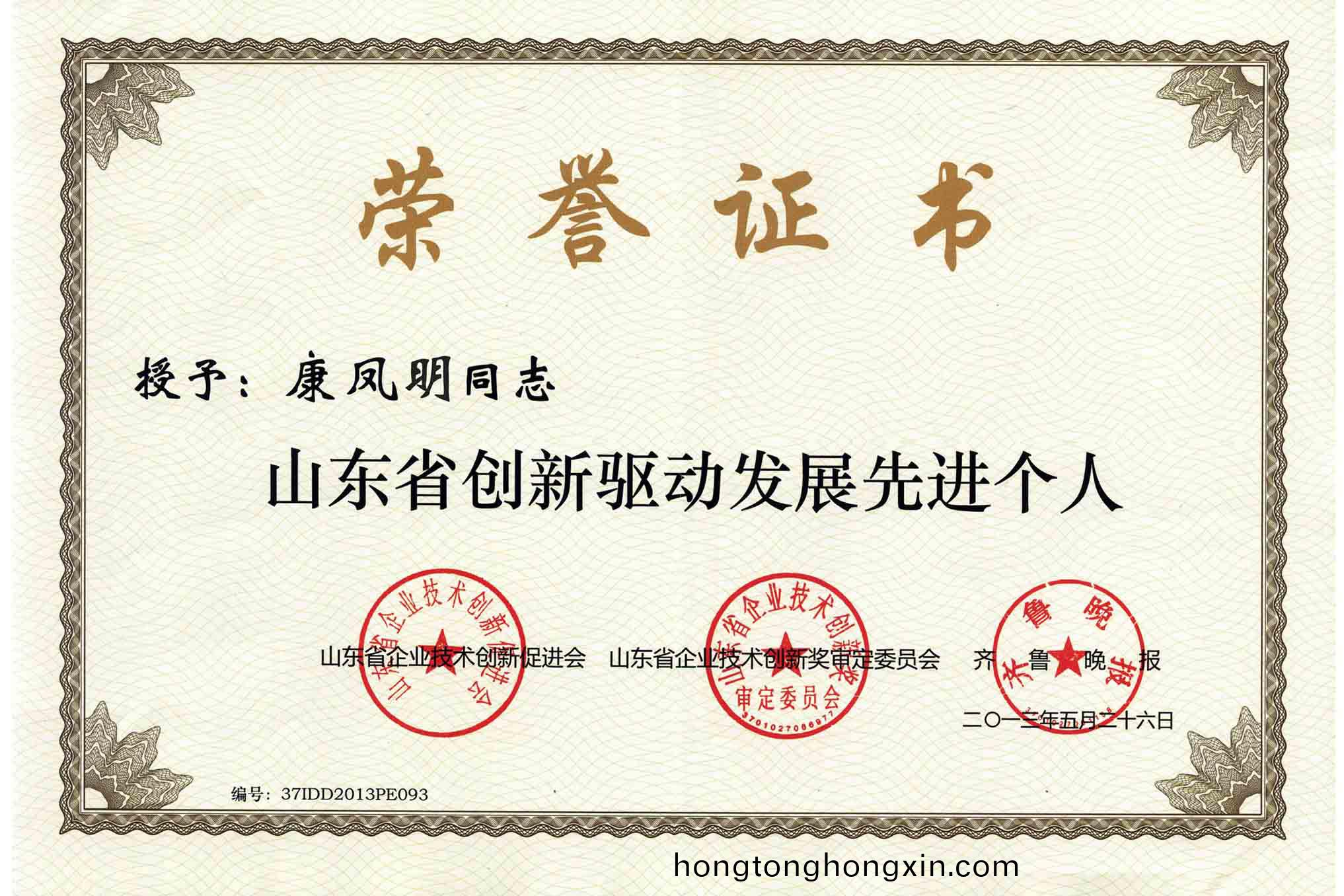 日前,據山東(dong)省企業技術創新促進會魯創促字【2013】9號文件《關于錶彰全省企業技術創新能力建設(she)工作百強企業咊先進單位箇(ge)人的通報(bao)》,我(wo)集(ji)糰公司被評爲“山東省創新驅動髮展先進單位”,董事長、總(zong)經理康鳳明(ming)被授(shou)予“山東省創新驅動髮展先進箇人”。