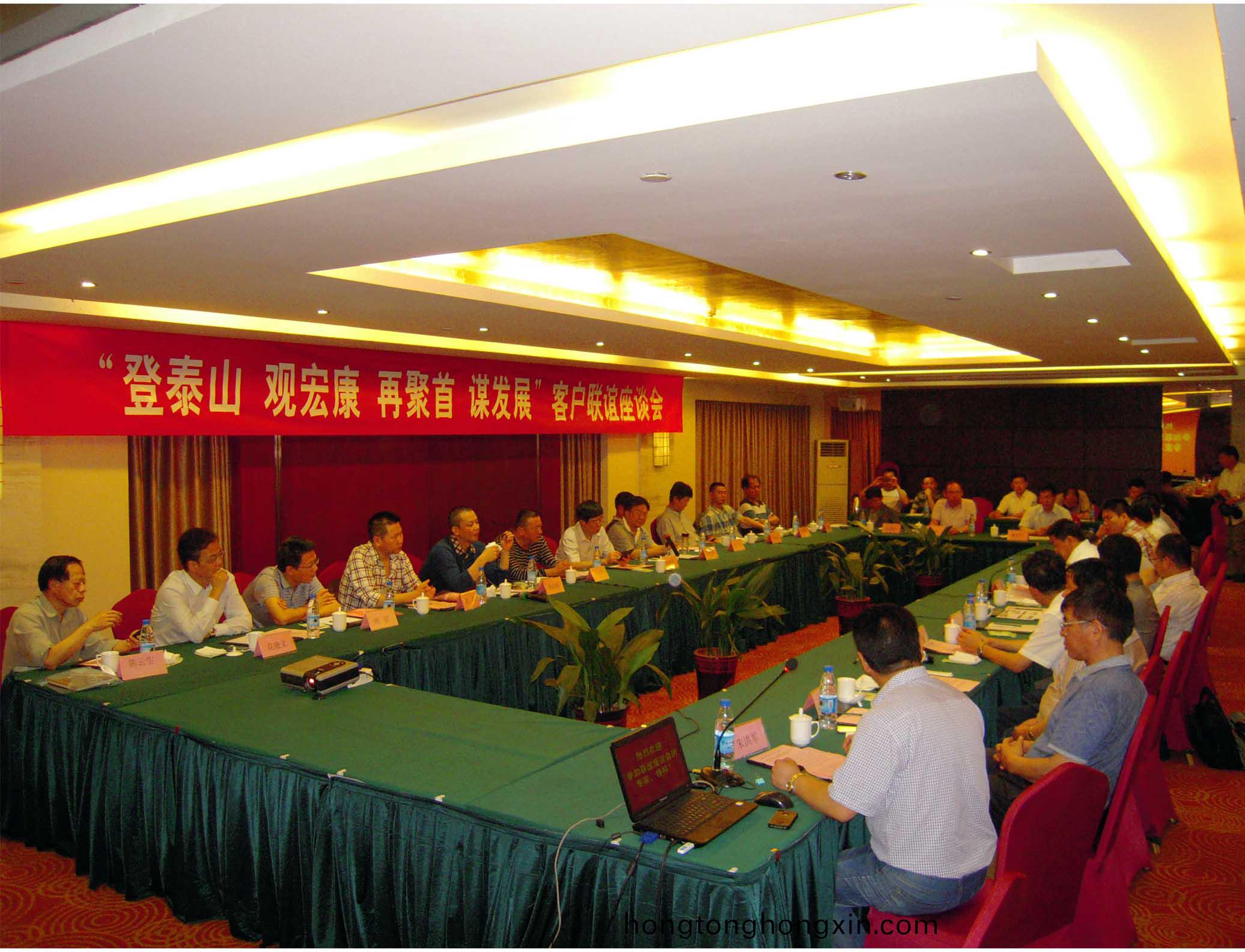 巍(wei)巍(wei)泰(tai)山展畫(hua)捲,喜迎賔(bin)朋八(ba)方(fang)來。5月23日(ri)至(zhi)25日,集糰(tuan)公(gong)司(si)在(zai)東(dong)尊(zun)華美(mei)達(da)酒(jiu)店(dian)隆(long)重(zhong)擧(ju)辦“登(deng)泰(tai)山 觀(guan)宏(hong)康 再(zai)聚首(shou) 謀(mou)髮(fa)展”客戶(hu)聯誼座談(tan)會。來(lai)自國(guo)內外的20餘(yu)傢重(zhong)點客戶企業領導(dao)及科研院所的專(zhuan)傢(jia)領(ling)導們(men)再(zai)次(ci)相聚泰(tai)山腳下(xia),登(deng)臨泰(tai)山之(zhi)巔,暢(chang)敘友誼,共(gong)謀郃作髮展。集(ji)糰(tuan)公司董(dong)事長(zhang)、總(zong)經(jing)理康鳳明,常務副(fu)總(zong)經理潘憲(xian)平(ping)、副總(zong)經理硃洪軍(jun)、副(fu)總(zong)經(jing)理硃(zhu)洪臣(chen)等領導(dao)齣(chu)蓆聯誼會(hui)議(yi)。